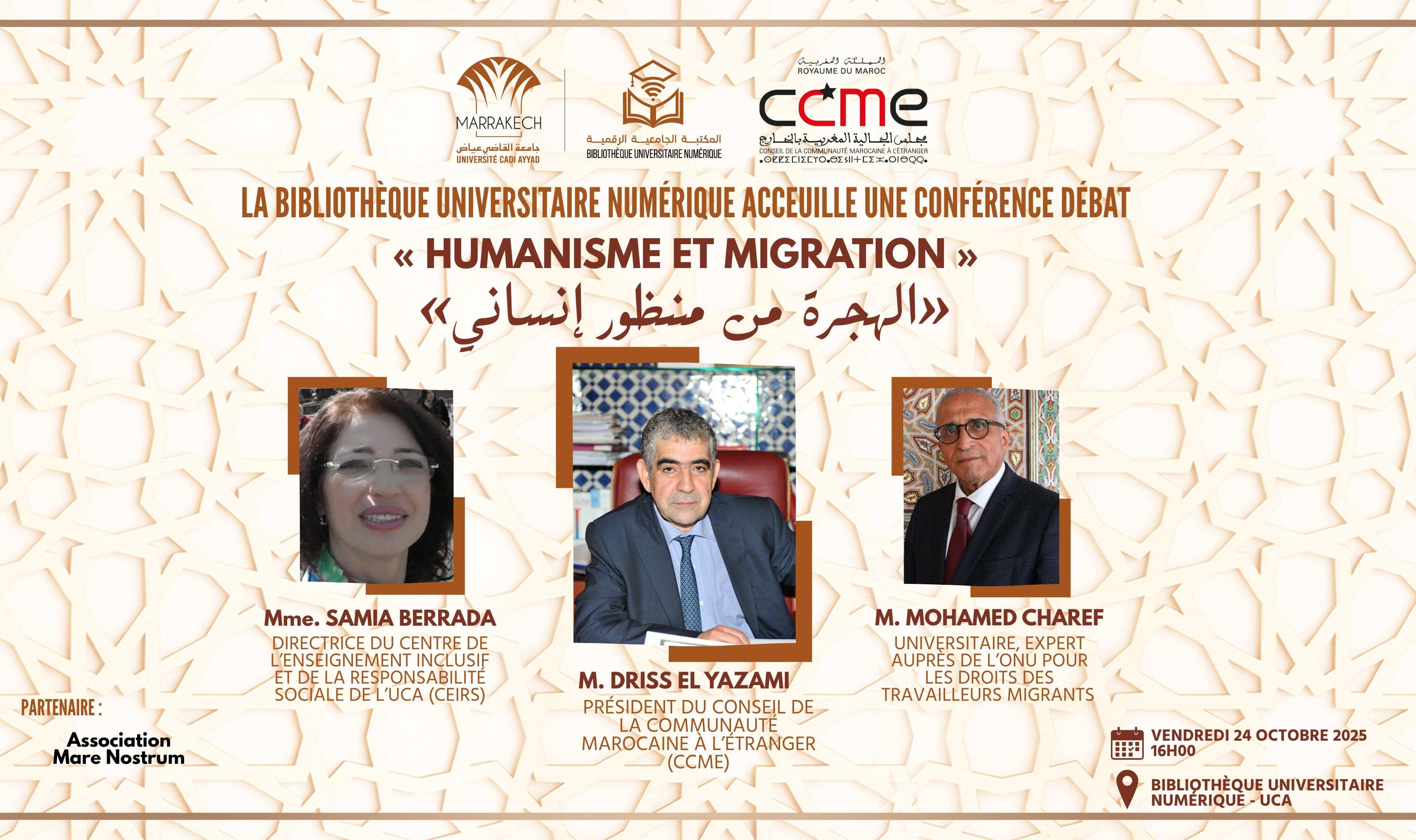 Conférence-Débat : « Humanisme et Migration » Dans le cadre de sa mission de promotion du dialogue intellectuel et de la réflexion sur les grandes questions de société, la Bibliothèque Universitaire