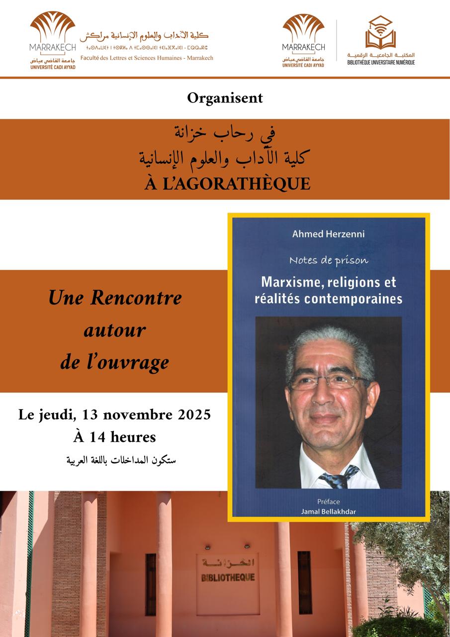 تنظم المكتبة الجامعية الرقمية وكلية الآداب والعلوم الإنسانية بجامعة القاضي عياض ندوة فكرية حول كتاب الفقيد الأستاذ أحمد حرزني، السفير المتجول المكلف بحقوق الإنسان، والرئيس السابق للمجلس الاستشاري